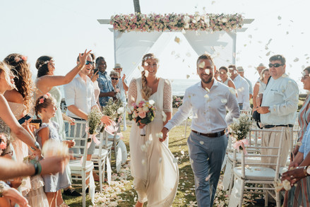 A small wedding with only family and close friends. With, among other things, an intimate ceremony by the water, a minimalist decoration and reception, a beautiful sunset, an Indonesian buffet to enjoy the flavors of Bali and our group of musicians to set the mood.